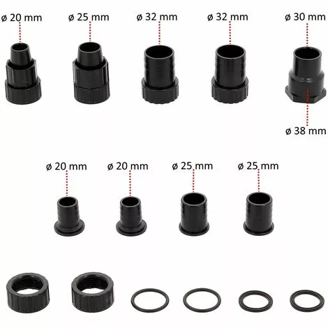 – Diamètre de raccordement du tuyau : Adaptable pour 20 mm (3/4′), 25 mm (1′), 30 et 32 mm (1 1/4′) et 38 mm (1 1/2′)